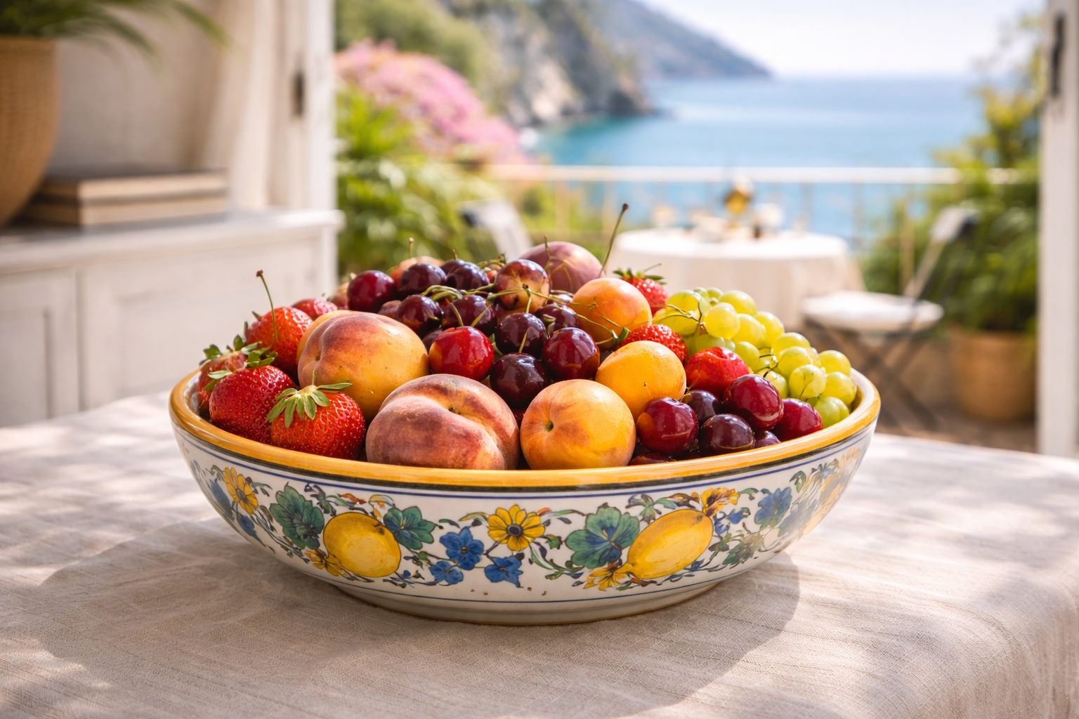 Per rinfrescare l’ambiente, un centrotavola di frutta fresca è un passepartout decorativo efficace. Se hai spazio, affiancalo a un vaso – anche monofiore – in vetro trasparente. Semplice, elegante, estivo.