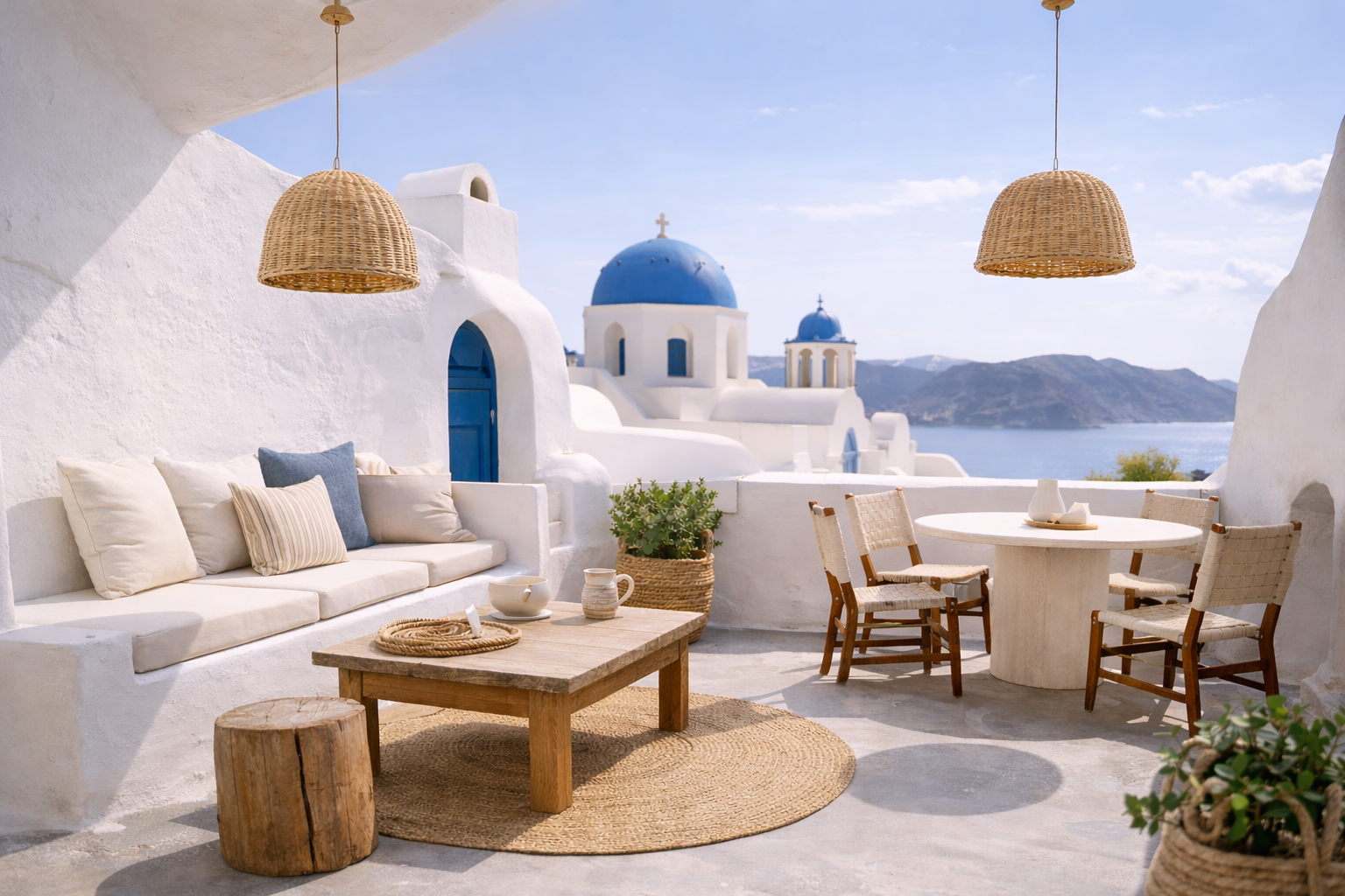 Negli ultimi tempi, molti si sono lasciati affascinare dal decoro tipico delle Cicladi: superfici bianche, contrasti netti, elementi in corda e legno grezzo.