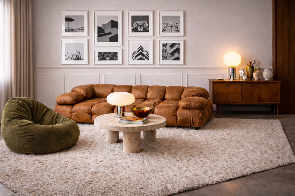 Le forme erano organiche, morbide e spesso giocose: divani modulari, sedute tondeggianti e tavoli dalle linee fluide. Oggi queste geometrie vengono rilette con proporzioni più equilibrate e tessuti di qualità, restituendo lo stesso senso di accoglienza con uno stile più attuale.